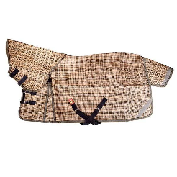 Extremely durable PVC mesh fly sheet by Baker Blankets. Made from 1000 x 2000 Denier polyester coated mesh fabric which is ideal for turnout as it’s made to withstand fading, mildew, soiling and normal wear and tear. Offering great insect protection, helps block harmful UV rays, and helps to keep your horse cleaner. Can be used over the top of other turnout blankets to increase life of the turnout. Easy on/off with 2 buckle strap front closure, belly surcingle straps, detachable elastic hind leg straps. Comes with a detachable neck cover for ultimate fly protection this summer. Mesh sheet allows for air circulation while nylon lined shoulders prevent rubs during turnout. Shoulder gussets allow for freedom of movement during play. Comes in the traditional Baker plaid color with a signature red tag.