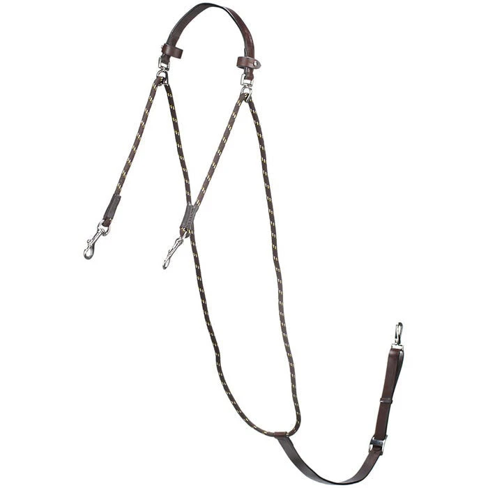 While lunging or doing ground line work, the Camelot Chambon teaches head set and strengthens the horse’s back by applying pressure to the poll and mouth of the horse when he raises his head, and releasing when the horse stretches long and low, down toward the ground. Recommended for use under experienced riders or trainers for best results. Imported.
