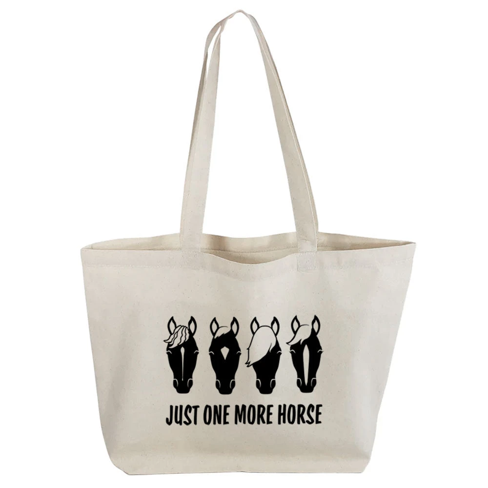 Just One More Horse canvas tote bag is great for running errands around town or packing for the barn. this canvas bag comes with long web handles for over the shoulder carrying. The tote bag measuring 19″ long by 13″ high is great for boots, snacks and so much more!