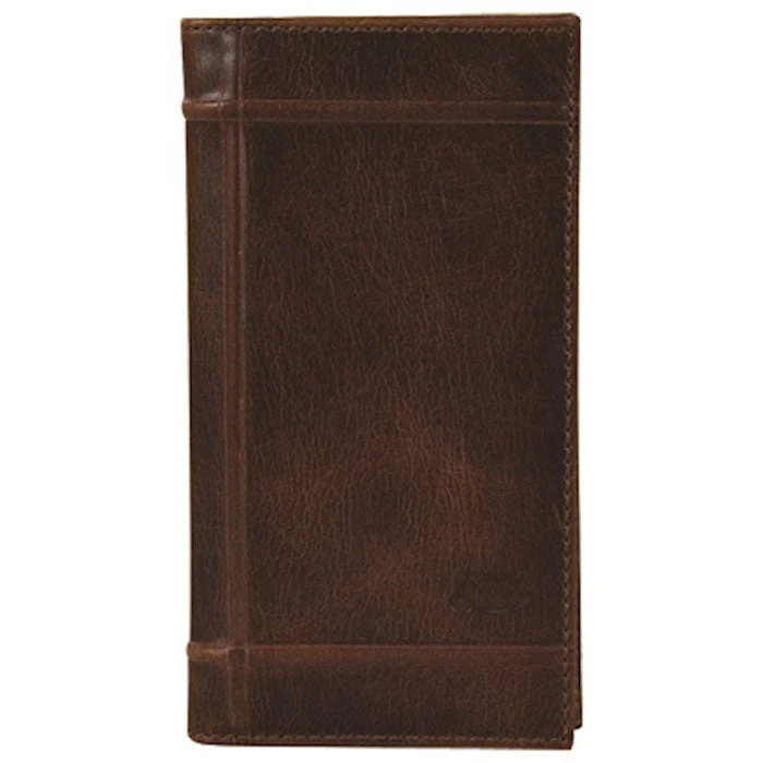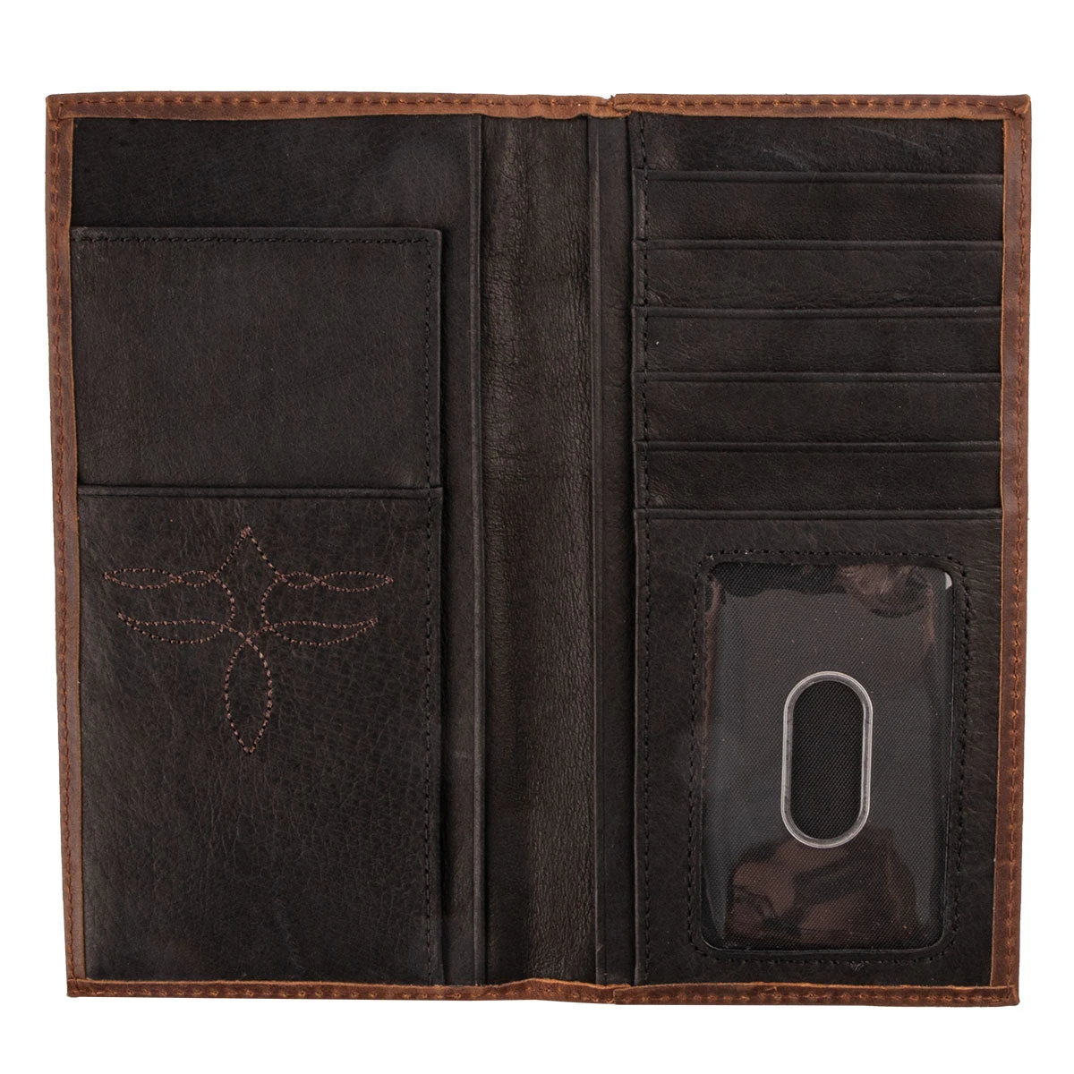 The Justin Rodeo Mens Wallet- Russet features a dark russet leather with milled detailing. On the interior there are 5 open slot pockets, 5 credit card slots, and 1 license holder.