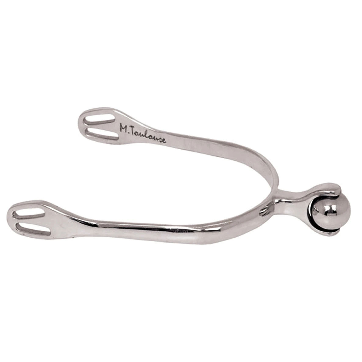 The M. Toulouse stainless steel Soft Touch Large Ball Spur is a humane and gentle design ideal for use with sensitive horses. The strap slots are angled for a more comfortable feel when the heel is down. The horizontally positioned ball makes more even contact with shorter riders or long barreled horses, but also works well for any size.