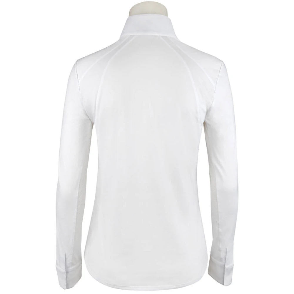 The RJ Classics Maddie 37.5 Ladies Show Shirt blends cutting edge technology with traditional styling to form the perfect synergy. The fabric features 37.5 patented thermo-regulation technology which has proven to help your body manage its core temperature and therefore, increase stamina. It keeps you comfortable by helping your body to maintain an optimum core temperature of 37.5รยฐ Celsius (99.5รยฐ Fahrenheit) which is ideal for peak athletic performance. The particles are naturally derived and work for the life of the product (it will never wash out!) This style also features a stylish Blue Medallion trim detail, a textured mesh for added comfort and breathability, and a zipper placket with snap collar to modernize this traditional look.