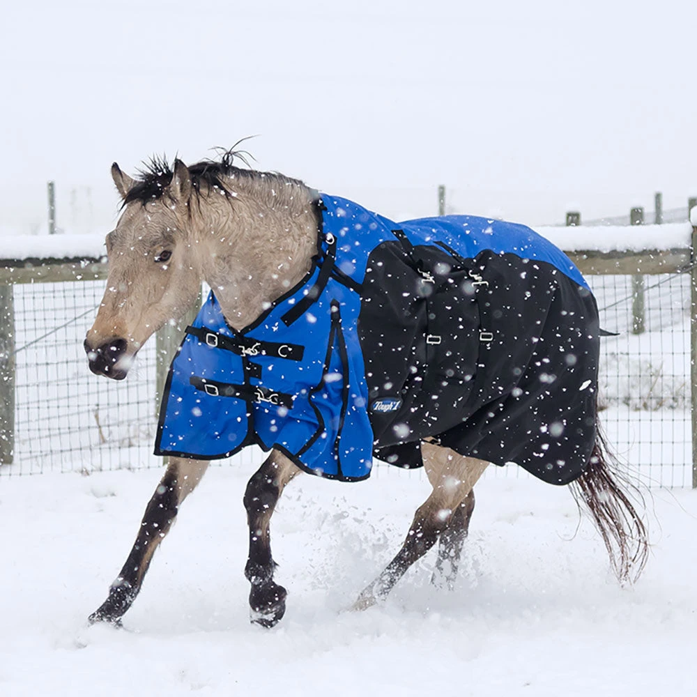 Waterproof turnout blanket with bellywrap by Tough 1. Offers the ultimate protection with 250g of polyfill and 1200 denier waterproof outershell. The Snuggit Neck feature allows for a more customized fit, ideal for hard to fit horses, narrow horses and horses with high withers. Belly wrap is adjustable and helps keep your horse warm. Replaceable and adjustable hind leg straps with elastic ends, double buckle open front with snap closures and shoulder gussets for freedom of movement during play and turnout time